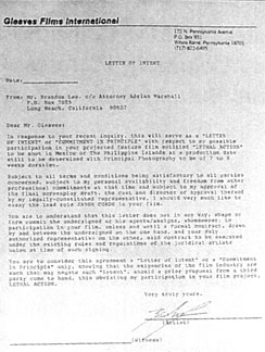 This "Letter of Intent" of "commitment in principle" related to Brandon's possible participation in a feature film entitled Lethal Action which was to be shot in Mexico or the Philippine Islands. Brandon was offered the lead role of Jason Corde and sent this signed letter to Gleaves Films International. |