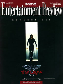 | Entertainment Preview, August 1994. This magazine was a monthly issue for retail customers of Ingram Entertainment, a video wholesaler. The Crow movie was featured on the cover as well as on a full-page ad inside. The wholesale price at time of release was $70.64 for VHS. The home video could be pre-ordered on August 26th and was released September 14th in both VHS and Laser Disc formats. |