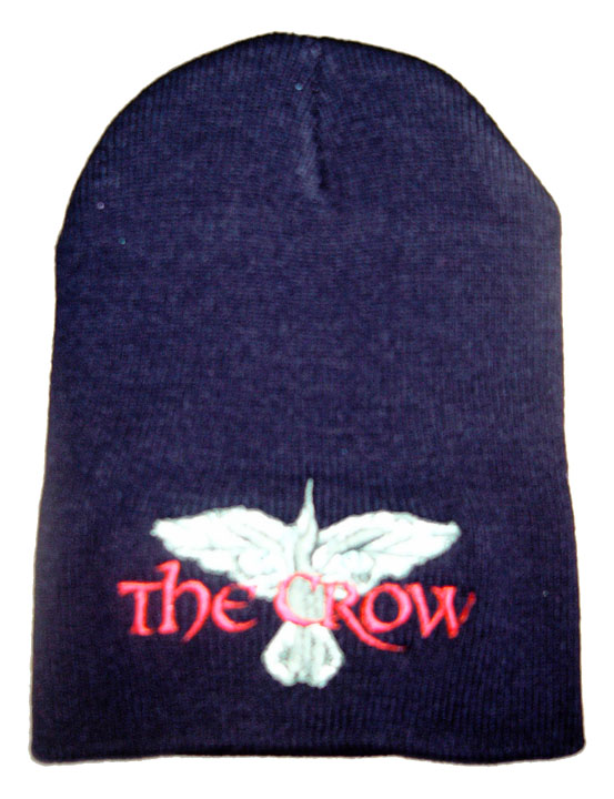 Black knit beanie with The Crow logo in red with an olive green crow design embroidered on the front. One size fits all. 100% acrylic. Imported. Issued fall 2004. Crowvision. MSRP: $16.99.