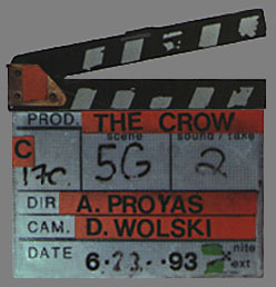 The Crow production slate board, June 1993. Used to mark the opening of each scene for editing, this was the slate used for the completion of the film. It shows production markings of the scene, take, and date along with the names of the director and cameraman. This slate was offered for auction last year in Heather Holmberg's catalog.