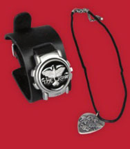 | This gift set features a watch and necklace. The watch has an embossed black band and flip-top face featuring The Crow logo. Necklace has a base metal guitar pick pendant with The Crow logo. Measures about 18". Imported. Issued Fall 2004. MSRP: $34.00. Model # 270952. |