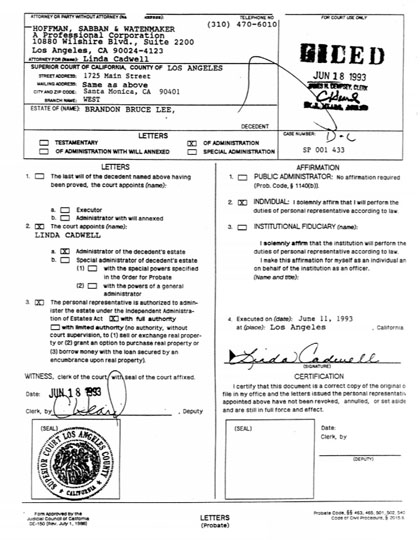 Here is a copy of the court document for administrative control over Brandon's estate. His mother, Linda Lee Caldwell, was granted the title in June, 1993.