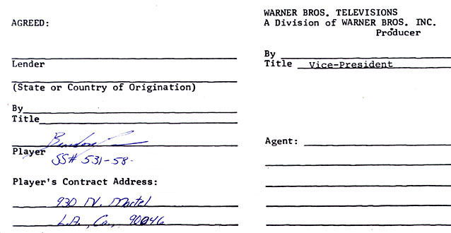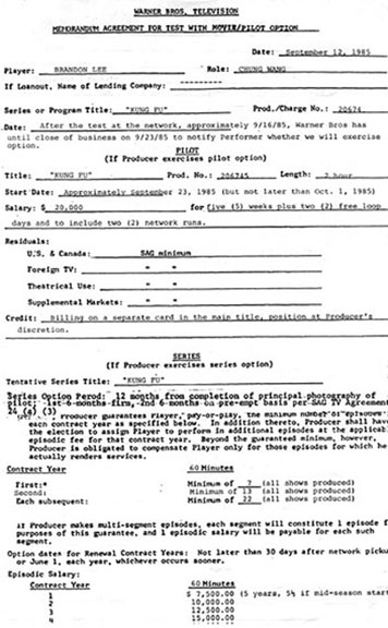 Shown above, Brandon's signature on his Warner Brothers Television/Movie contract. This memorandum agreement was for a screen test with a movie/pilot option for the program "Kung Fu", and specified an initial payment to Brandon of $20,000 for 5 weeks of work. Consisting of two 8-1/2" x 14" pages, it was signed on the second page and completed in Brandon's handwriting. This Movie of the Week was an attempt to revive this popular show of the 1970s. Brandon played the role of David Carradine's young son, Chung Wang. His father, Bruce, played a large part in the developing the original plot. The original Kung Fu series was a source of great aggravation for Bruce - he lost the lead role which he developed for himself to David Carradine in the end. (The network executives thought no one would watch a Chinese man.) This exceedingly rare document has tremendous provenance coupling him with the art that made his father's career. Given the tragically short life of Brandon Lee, this contract represents one of a very few documents that was ever offered on the market from this rising star's career. This is the earliest known TV or film document signed by Brandon. It was sold at auction directly from Brandon's estate to a private collector in 1995. |