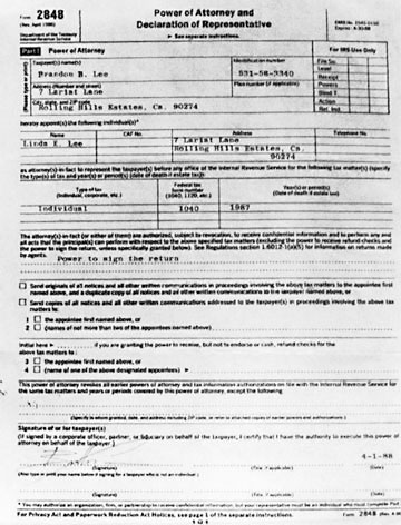 A Power of Attorney signed document, dated April 1, 1988. This document gave Linda Lee the power to sign Brandon Lee's tax return. Shown below, a signature from a different Power of Attorney document.