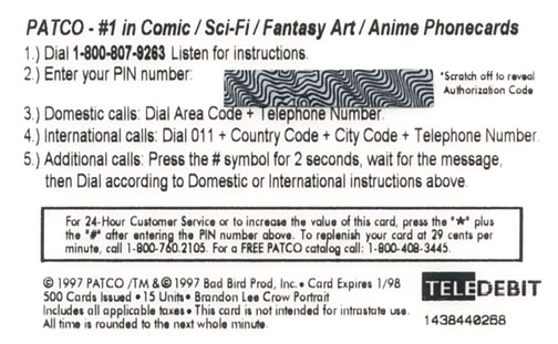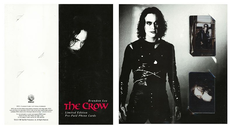 The Crow 15-unit phone cards, limited edition of 500 made in 1997 by PATCO. Two cards were issued in a 10" x 4-1/2" folder, shown above.