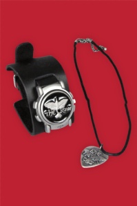 | This gift set features a watch and necklace. The watch has an embossed black band and flip-top face featuring The Crow logo. Necklace has a base metal guitar pick pendant with The Crow logo. Measures about 18". Imported. Issued Fall 2004. MSRP: $34.00. Model # 270952. |