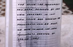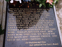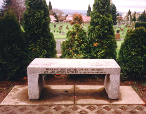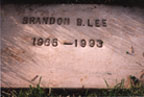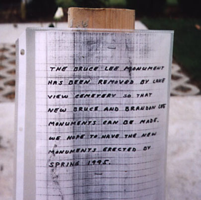 | Photo of the inscription from Brandon Lee's grave in Seattle. Below are three more photos - the original basic gravestone, a 1994 letter posted by the Cemetery explaining that new monuments were being made for Bruce and Brandon, the current site, and stone bench in front of grave with inscription from Linda and Shannon. Click on any photo below to see an enlargement. |