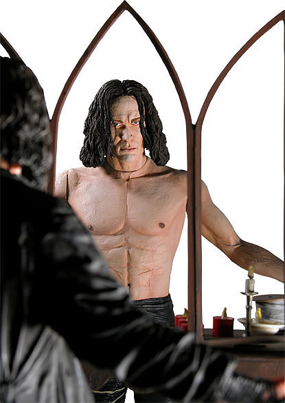 Action Figure Set Features Eric Draven and The Crow. Comes with "crow", mask, make-up, tape, ring necklace, and candles. 12 Points of Articulation for both figures. Comes in 4 Color Window-box. Issued Fall 2004. NECA Model # 39652.