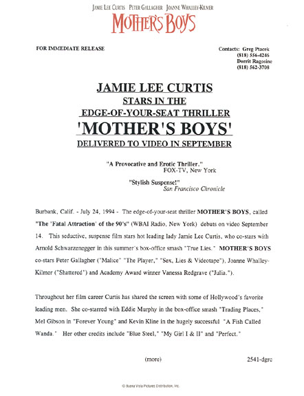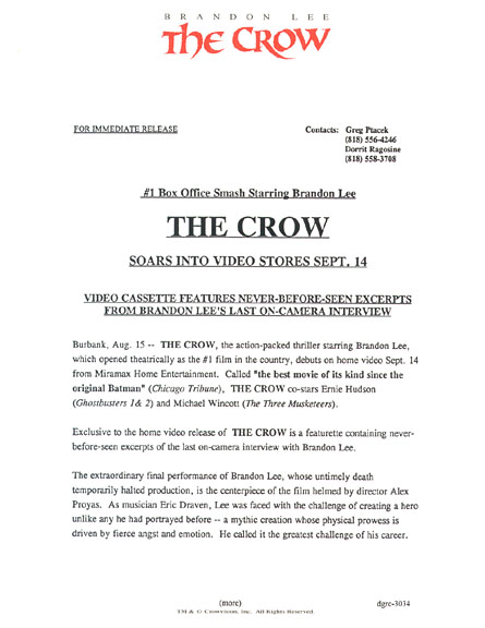 | This press kit was mailed out to video retailers on August 12, 1994 to announce the release of The Crow and Mother's Boys on home video September 14th. Included in the 9" x 12" envelope was a tattoo with custom backing card, one black & white publicity photo for each movie, and three pages of press notes for each. Click on any image below for enlargement. |