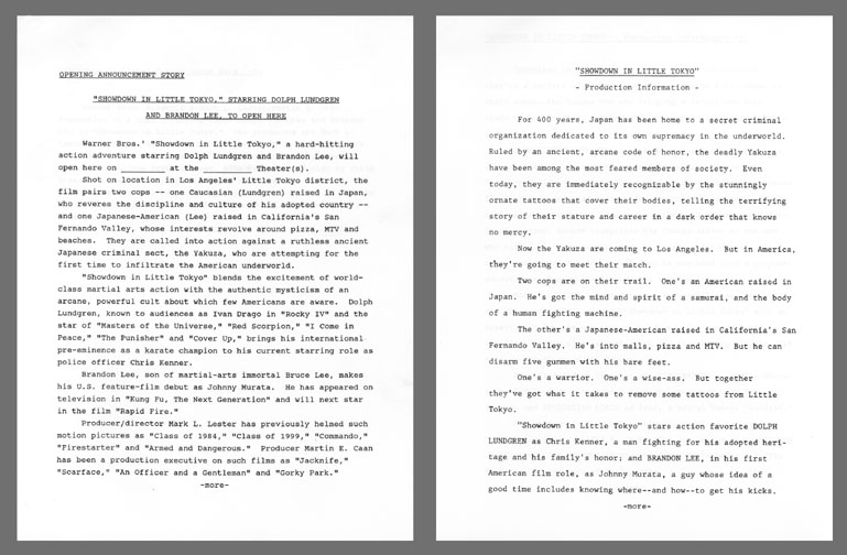 Showdown In Little Tokyo press kit cover. Included were 2 B&W stills and 19 pages of press info.